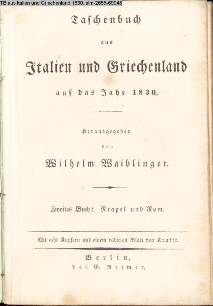 Taschenbuch / aus / Italien und Griechenland / auf das Jahr 1830. / Herausgegeben / von / Wilhelm Waiblinger. / Zweites Buch: Neapel und Rom. / Mit acht Kupfern und einem radirten Blatt von Krafft / Berlin, / bei G. Reimer.
