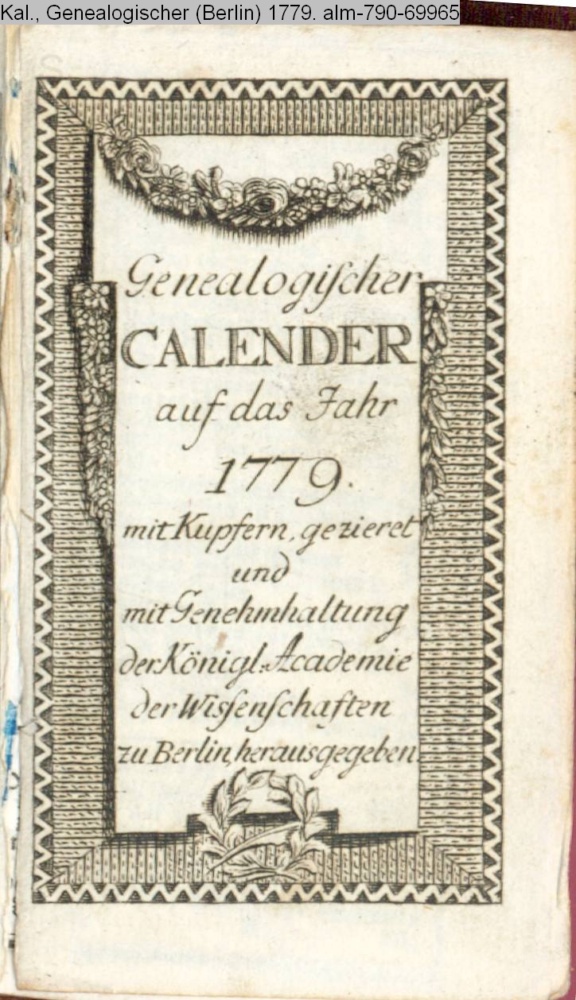 Genealogischer / CALENDER / auf das Jahr / 1779. / mit Kupfern gezieret / und / mit Genehmhaltung / der Königl. Academie / der Wissenschaften / zu Berlin, herausgegeben