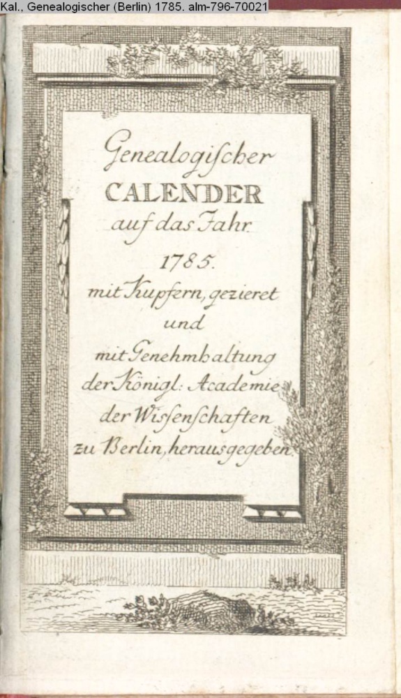 Genealogischer / CALENDER / auf das Jahr / 1785. / mit Kupfern gezieret / und / mit Genehmhaltung / der Königl. Academie / der Wissenschaften / zu Berlin herausgegeben