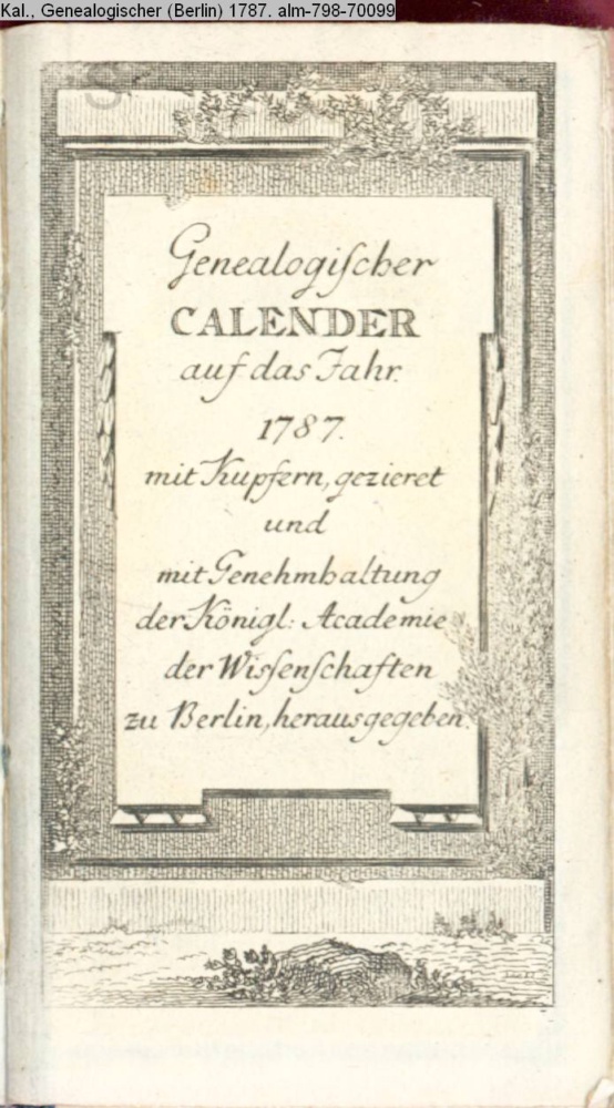 Genealogischer / CALENDER / auf das Jahr / 1787. / mit Kupfern gezieret / und / mit Genehmhaltung / der Königl. Academie / der Wissenschaften / zu Berlin, herausgegeben
