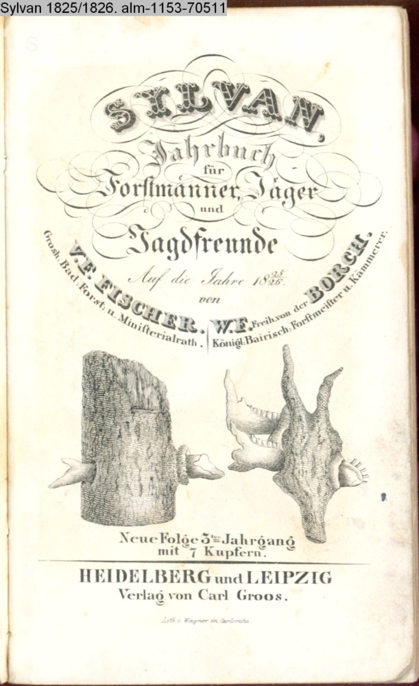 SILVAN, / Jahrbuch / für Forstmänner, Jäger / und / Jagdfreunde / Auf die Jahre 1825/26. / von / V. F. FISCHER. / Grosh. Bad. Forst. u. Ministerialrath. / W. F. Freih. von der BORCH. / Königl. Bairisch. Forstmeister u. Kämmerer. / Neue Folge 3ter Jahrgang. / mit 7 Kupfern. / HEIDELBERG und LEIPZIG / Verlag von Carl Groos