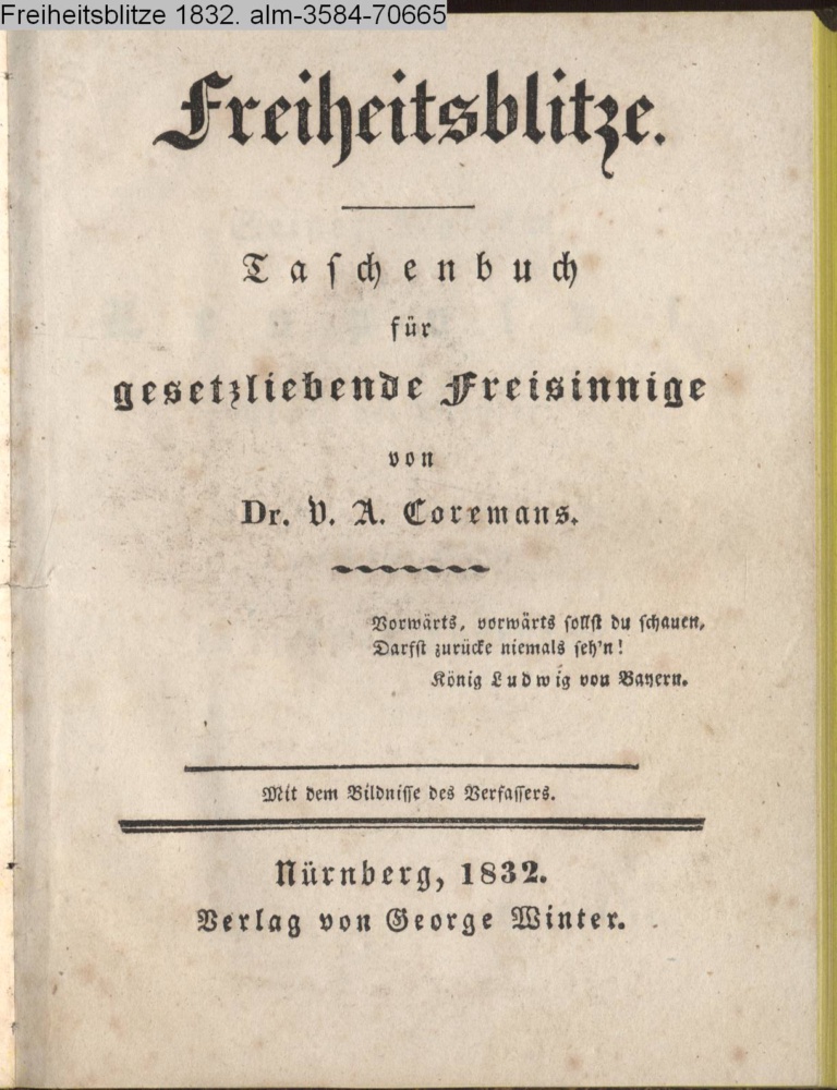 Freiheitsblitze. / Taschenbuch / für / gesetzliebende Freisinnige / von / Dr. V. A. Coremans. / Vorwärts, vorwärts sollst du schauen, / Darfst zurücke niemals seh'n! / König Ludwig von Bayern. / Mit dem Bildnisse des Verfassers. / Nürnberg, 1832. / Verlag von George Winter