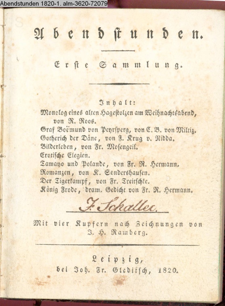 Abendstunden. / Erste Sammlung. / Inhalt: […] / Mit vier Kupfern nach Zeichnungen von / J. H. Ramberg. / Leipzig, / bei Joh. Fr. Gleditsch, 1820