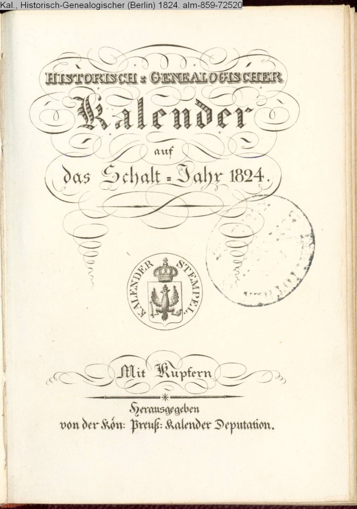 HISTORISCH-GENEALOGISCHER / Kalender / auf / das Schalt-Jahr 1824. / Mit Kupfern / Herausgegeben / von der Kön. Preuß. Kalender Deputation