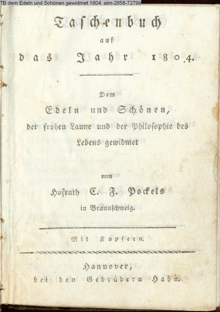 Taschenbuch / auf das Jahr / 1804. / Dem / Edeln und Schönen, / der frohen Laune und der Philosophie des / Lebens gewidmet / von C. F. Pockels / in Braunschweig. / Mit Kupfern. / Hannover. / bey den Gebrüdern Hahn