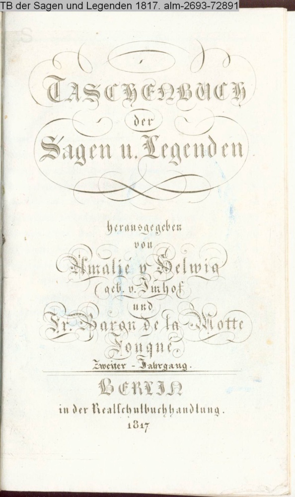 TASCHENBUCH / der / Sagen u. Legenden / herausgegeben / von / Amalie v. Helwig / geb. v. Imhof / und / Fr. Baron de la Motte / Fouqué / Zweiter - Jahrgang / BERLIN / in der Realschulbuchhandlung. / 1817