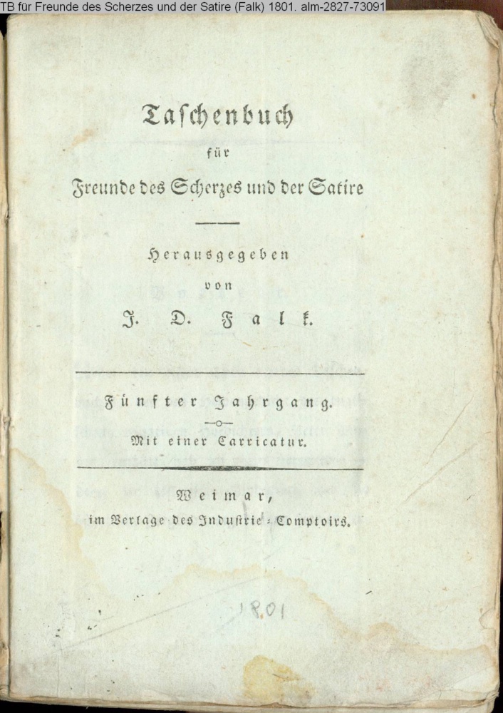 Taschenbuch / für / Freunde des Scherzes und der Satire / Herausgegeben / von / J. D. Falk. / Fünfter Jahrgang. / Mit einer Carricatur. / Weimar, / im Verlage des Industrie-Comptoirs