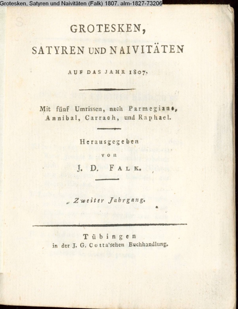 GROTESKEN, / SATYREN UND NAIVITÄTEN / auf das Jahr 1807. / Mit fünf Umrissen, nach Parmegiano, / Annibal, Carrach, und Raphael. / Herausgegeben / von / J. D. Falk. / Zweiter Jahrgang. / Tübingen / in der J. G. Cotta'schen Buchhandlung.
