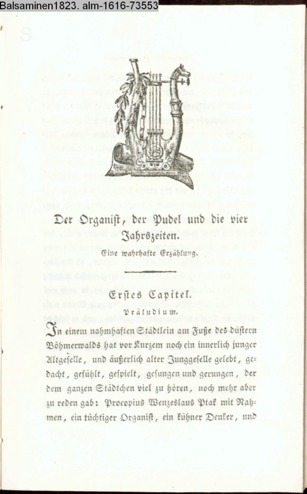 Vignette über dem Titel »Der Organist, der Pudel und die vier Jahrszeiten. Eine wahrhafte Erzählung«