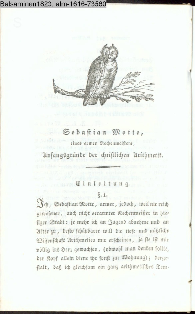Vignette über dem Titel: »Sebastian Motte, eines armen Rechenmeisters, Anfangsgründe der christlichen Arithmetik«