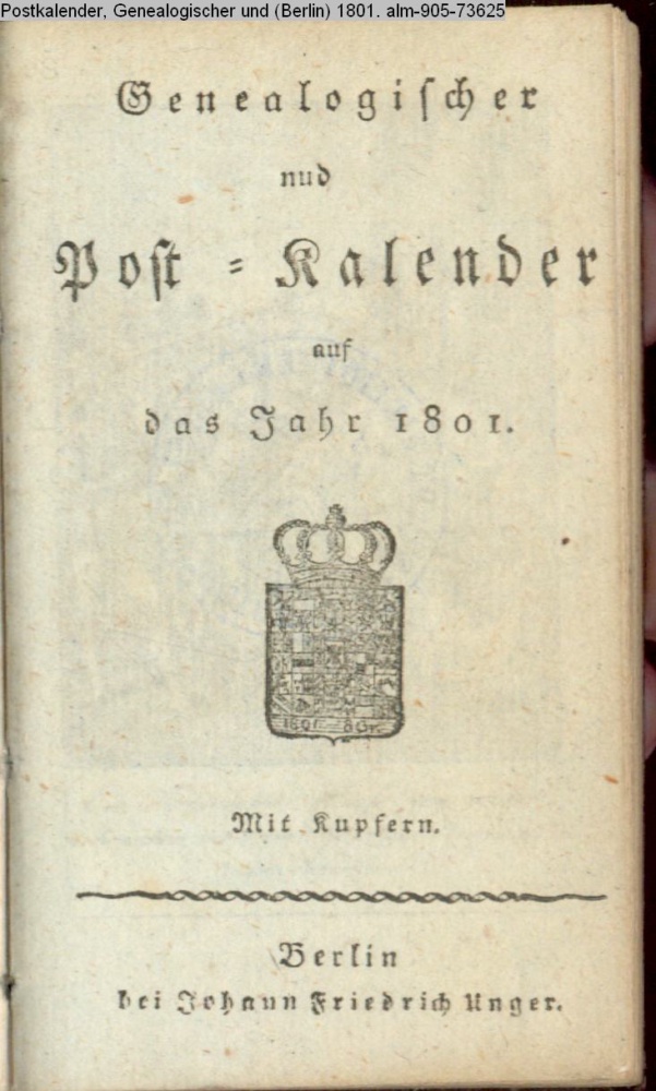 Genealogischer / und / Post-Kalender / auf / das Jahr 1801. / Mit Kupfern. / Berlin / bei Johann Friedrich Unger