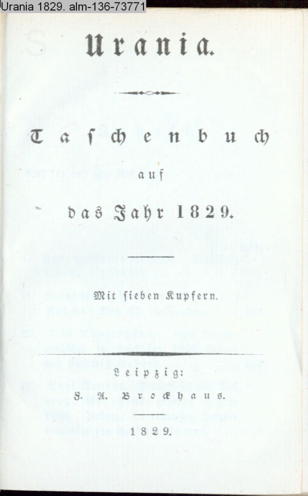 Urania. / Taschenbuch / auf / das Jahr 1829. / Mit sieben Kupfern. / Leipzig. / F. A. Brockhaus. / 1829