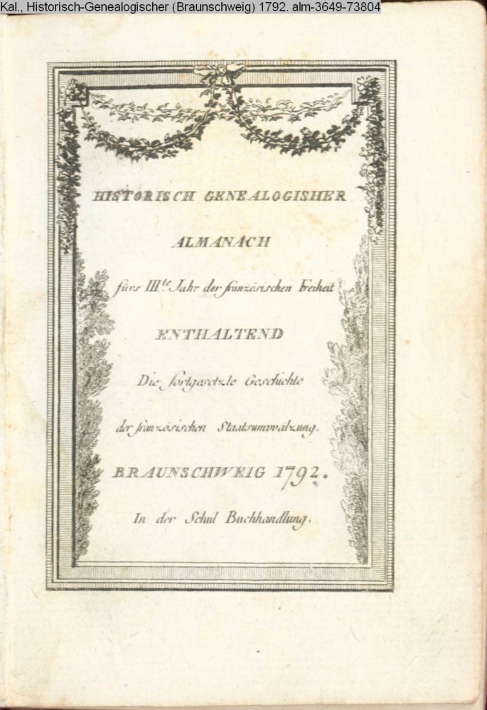HISTORISCH GENEALOGISCHER / ALMANACH / fürs IIIte Jahr der französischen Freiheit / ENTHALTEND / Die fortgesetzte Geschichte / der französischen Staatsumwälzung. / BRAUNSCHWEIG 1792. / In der Schul Buchhandlung