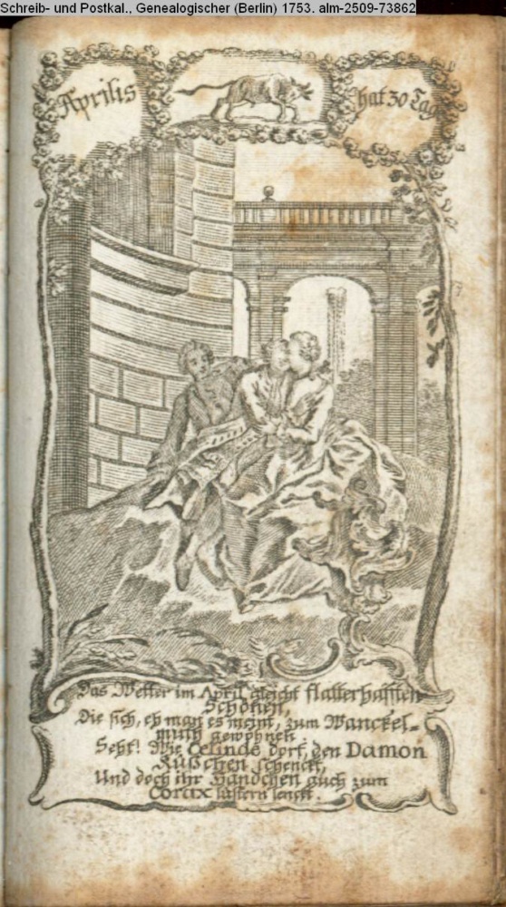 Aprilis hat 30 Tage / Das Wetter im April gleicht flatterhaften / Schönen, Die sich, eh man es meint, zum Wanckel- / muth gewöhnen. / Seht! Wie Celinde dort, dem Damon / Küßchen schenkt, / Und doch ihr Händchen auch zum / Corax lüstern lenckt