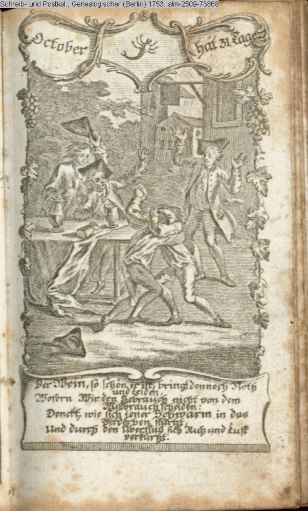 October hat 31 Tage / Der Wein, so schön er ist, bringt dennoch Noth / und Leiden. / Wofern Wir den Gebrauch nicht von dem / Mißbrauch scheiden: / Denckt, wie sich jener Schwarm in das / Verderben stürtzt, / Und durch den Überfluß sich Ruh und Lust / verkürtzt!