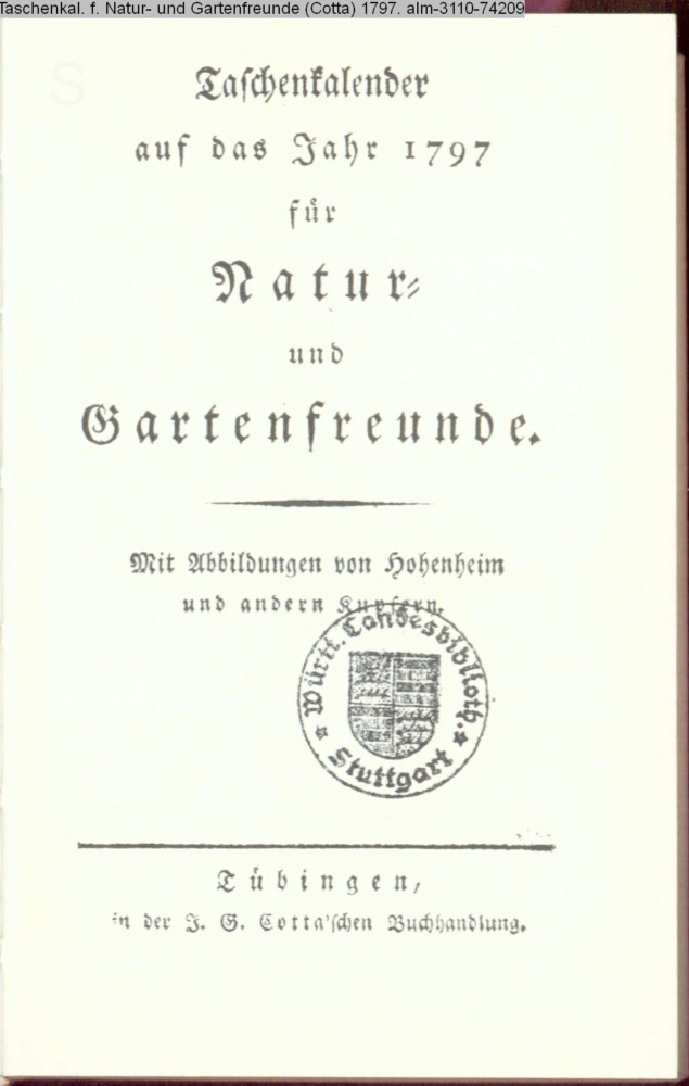 Taschenkalender / auf das Jahr 1797 / für / Natur- / und Gartenfreunde. / Mit Abbildungen von Hohenheim / und andern Kupfern. / Tübingen, / in der J. G. Cotta'schen Buchhandlung