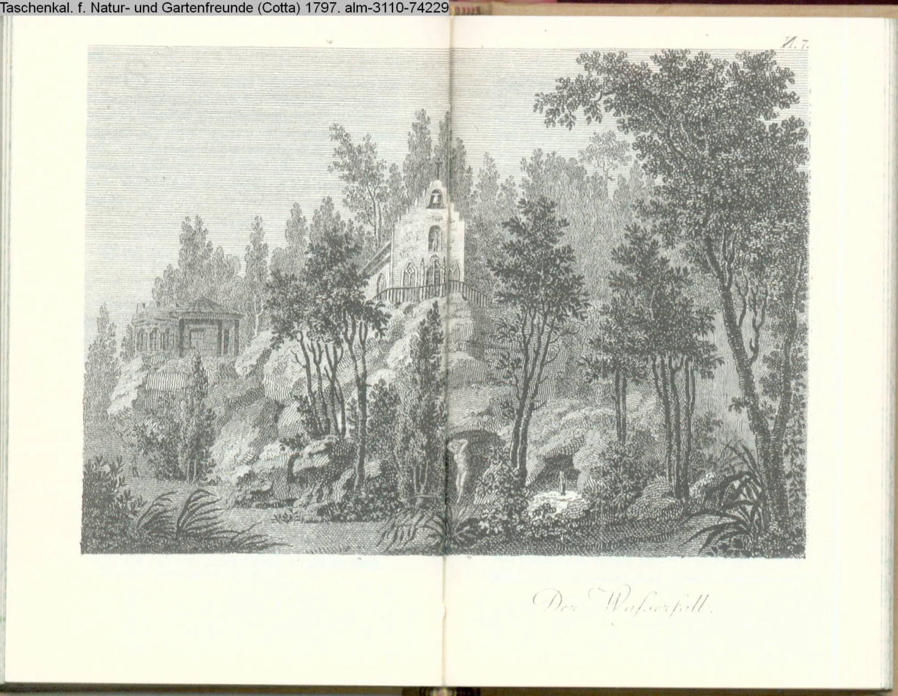 Illustration zu »Beschreibung des Gartens in Hohenheim. Zweite Fortsetzung. / Der grosse Wasserfall« von G. H. Rapp INr 74228, Obj 22