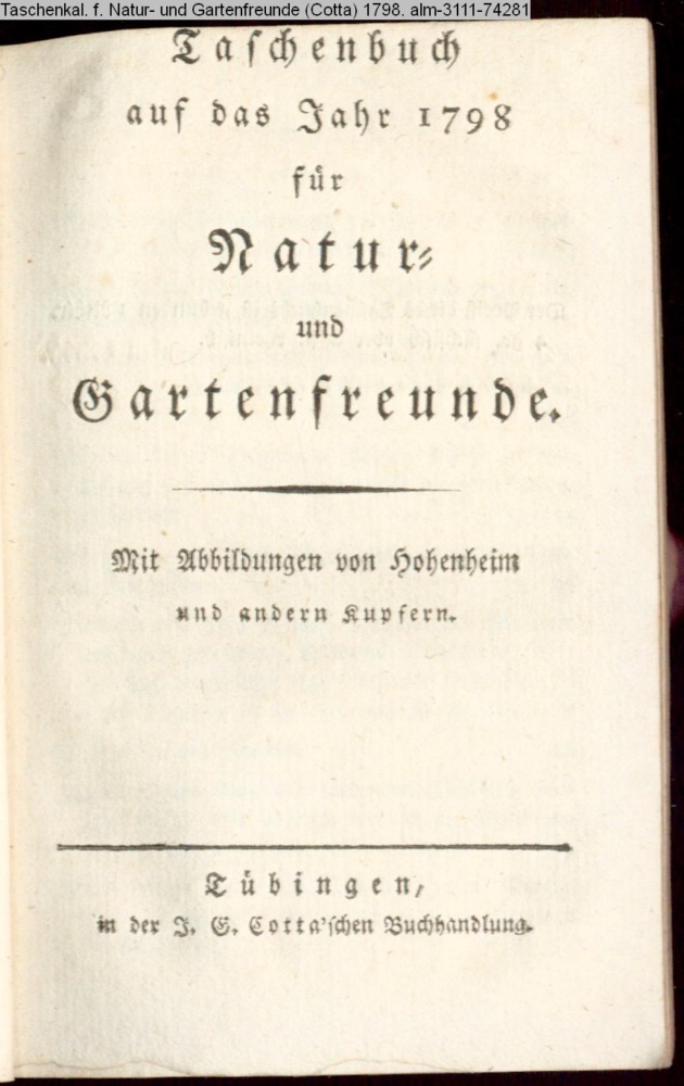 Taschenbuch / auf das Jahr 1798 / für / Natur- / und / Gartenfreunde. / Mit Abbildungen von Hohenheim / und andern Kupfern. / Tübingen, / in der Cotta'schen Buchhandlung