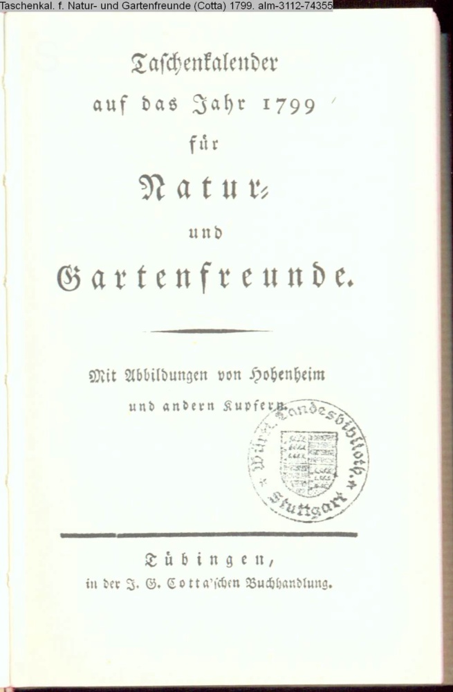 Taschenkalender / auf das Jahr 1799 / für / Natur- und / Gartenfreunde. / Mit Abbildungen von Hohenheim / und andern Kupfern. / Tübingen / in der J. G. Cotta'schen Buchhandlung
