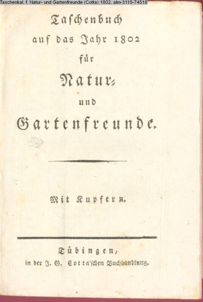 Taschenbuch / auf das Jahr 1802 / für / Natur - / und / Gartenfreunde. / Mit Kupfern. / Tübingen, / in der J. G. Cotta'schen Buchhandlung
