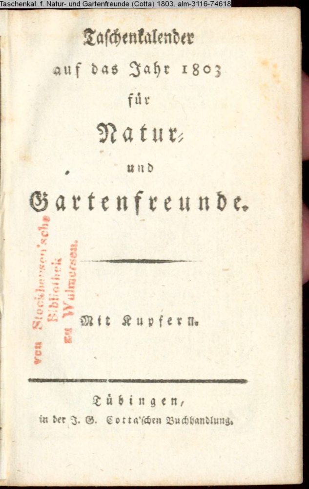 Taschenkalender / auf das Jahr 1803 / für / Natur- / und / Gartenfreunde. / Mit Kupfern. / Tübingen, / in der J. G. Cotta'schen Buchhandlung