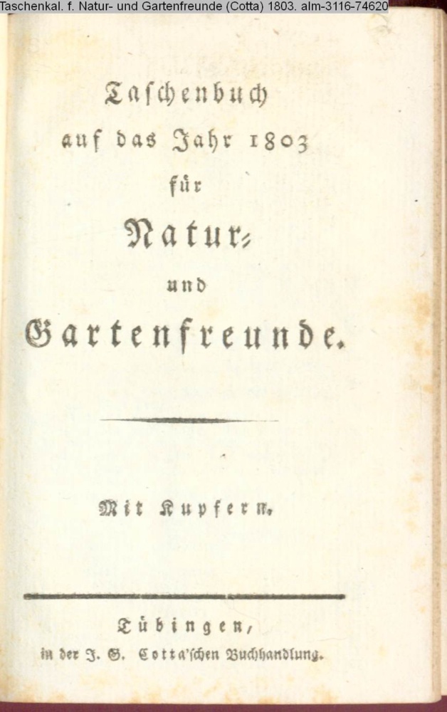 Taschenbuch / auf das Jahr 1803 / für / Natur- / und / Gartenfreunde. / Mit Kupfern. / Tübingen, / in der J. G. Cotta'schen Buchhandlung