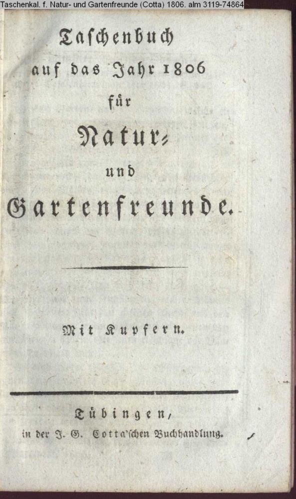 Taschenbuch / auf das Jahr 1806 / für / Natur- / und / Gartenfreunde. / Mit Kupfern. / Tübingen, / in der J. G. Cotta'schen Buchhandlung
