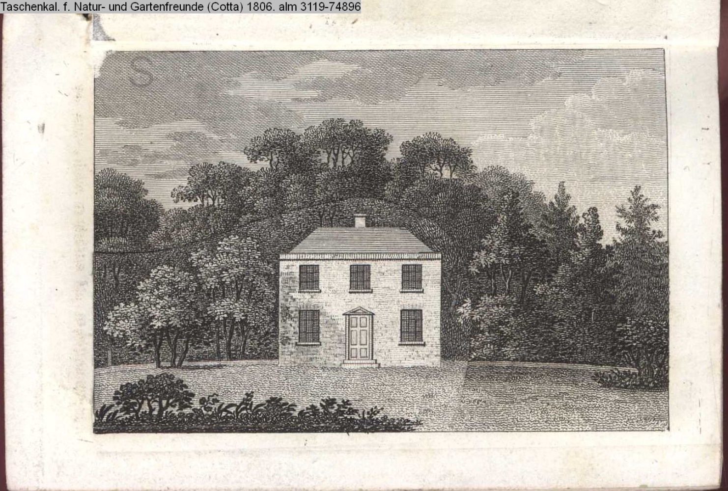 Illustration (vorgeklappter Zustand) zu »Landschaftsgärtnerey« (Observationson the theory and practice of Landscape Gardening […] By H. Repton. Esq. London. J. Taylor, 1803)« in: Taschenkalender für Natur- und Gartenfreunde (Cotta) 1805; INr 74774 ff
