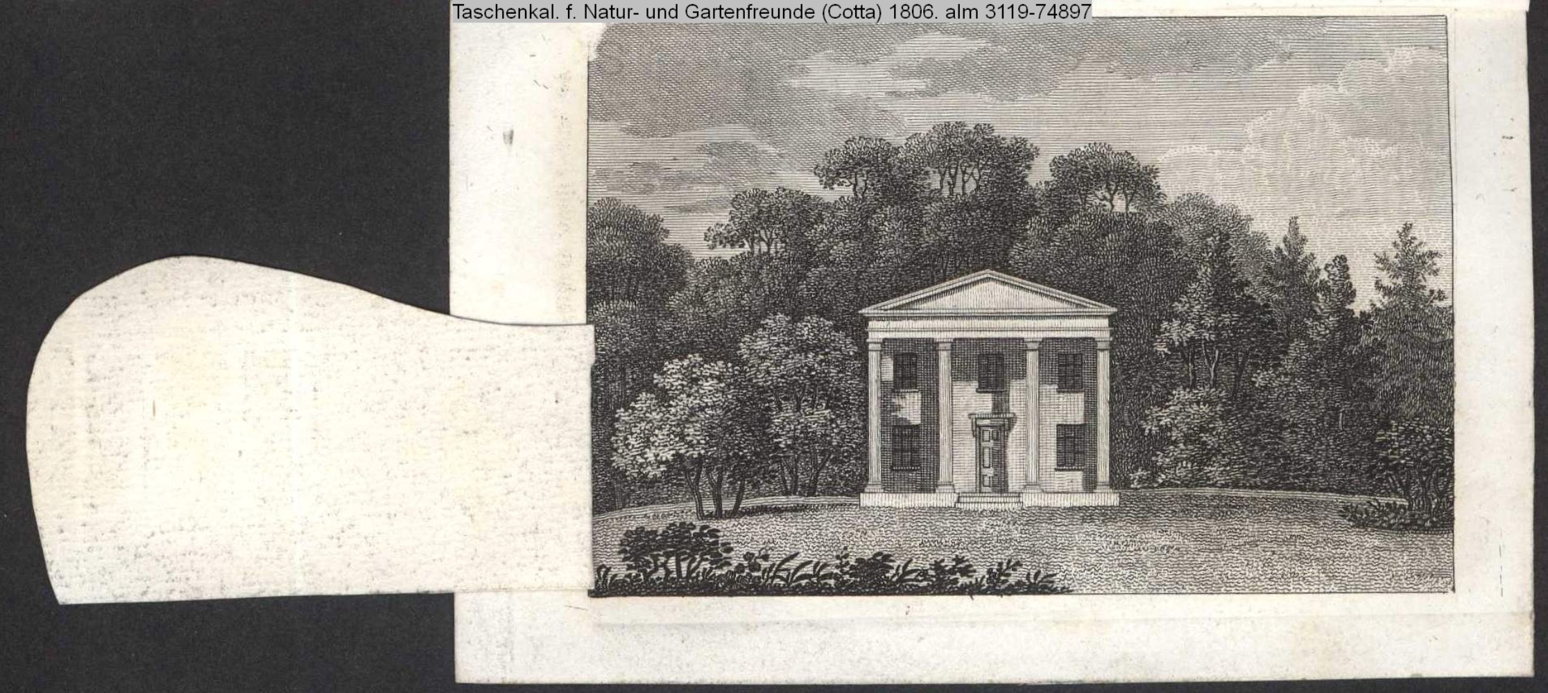 Illustration (aufgeklappter Zustand) zu »Landschaftsgärtnerey« (Observationson the theory and practice of Landscape Gardening […] By H. Repton. Esq. London. J. Taylor, 1803)« in: Taschenkalender für Natur- und Gartenfreunde (Cotta) 1805; INr 74774 ff