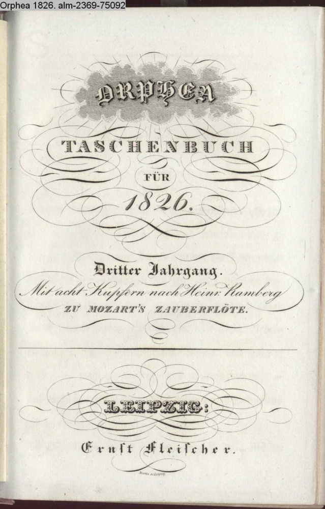 ORPHEA / TASCHENBUCH / FÜR / 1826. / Dritter Jahrgang. / Mit acht Kupfern nach Heinr. Ramberg / ZU MOZART'S ZAUBERFLÖTE / LEIPZIG. / Ernst Fleischer