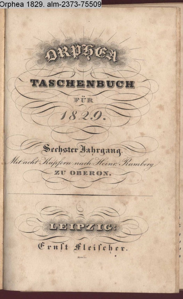 ORPHEA / TASCHENBUCH / FÜR / 1829. / Sechster Jahrgang. / Mit acht Kupfern nach Heinr. Ramberg / ZU OBERON. / LEIPZIG. / Ernst Fleischer