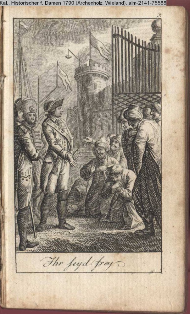 Illustration zu »Einige Denkmahle des Edelmuths und der Tapferkeit aus dem jetzigen Kriege wider die Türken / 3. Joseph der Zweyte, befreyet die Türkischen Kaufleute von ihrem Gefängniß in Fiume« INr 75608, Obj 33