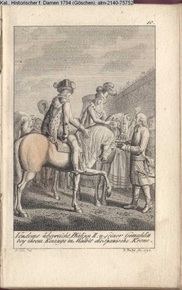 Vendome überreicht Philipp II. u. seiner Gemahlin / bey ihrem Einzuge in Madrit die Spanische Krone