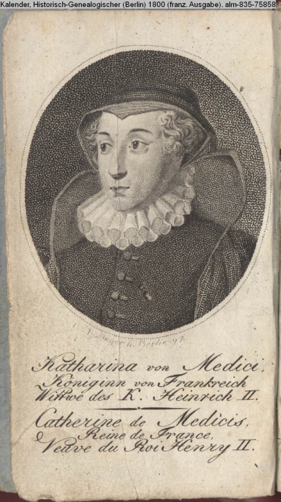 Katharina von Medici, / Königinn von Frankreich / Wittwe des K. Heinrich II. / Catherine de Medicis, / Reine de France. / Veuve du Roi Henry II.