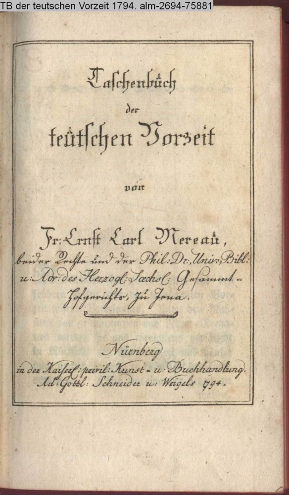 Taschenbuch / der / teutschen Vorzeit / von / Fr. Ernst Carl Mereau, / beider Rechte und der Phil. Dr., Univ. Bibl. / u. Adv. des Herzog. Saechs. Gesammt- / Hofgerichts zu Jena. / Nürnberg / in der Kaiserl. privil. Kunst- u. Buchhandlung. Ad. Gottl. Schneider u. Weigels 1794
