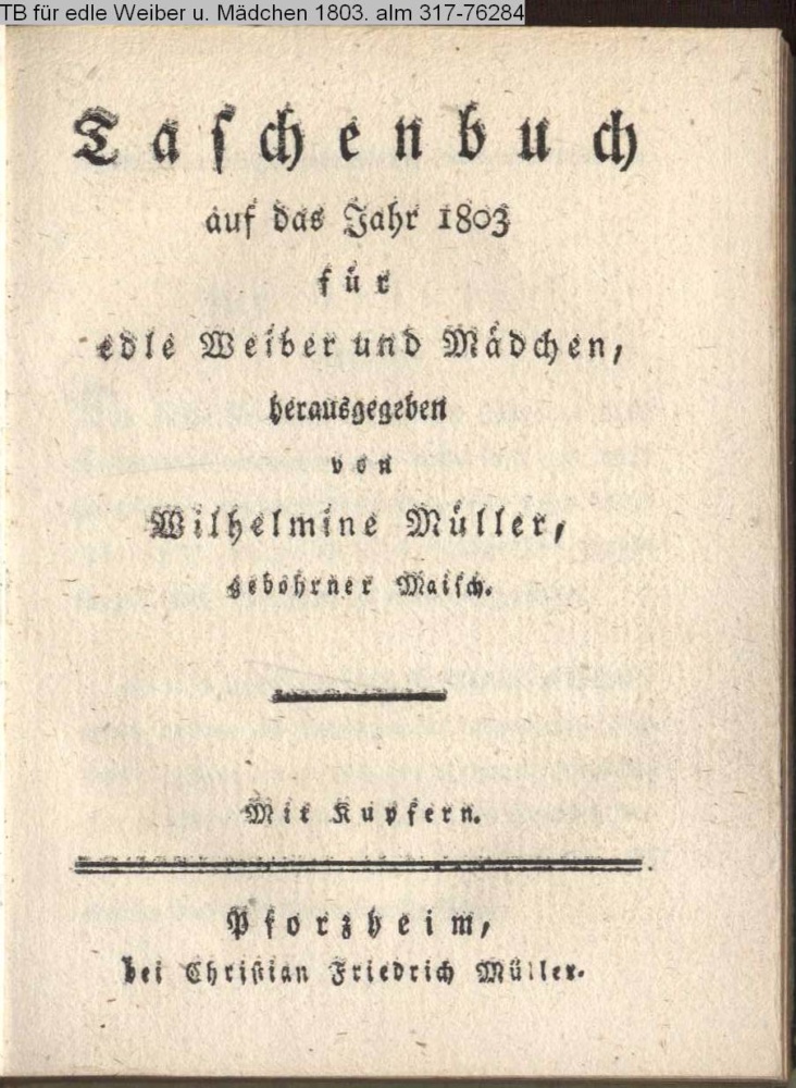 Taschenbuch / auf das Jahr 1803 / für / edle Weiber und Mädchen, / herausgegeben / von / Wilhelmine Müller, / gebohrner Maisch. / Mit Kupfern. / Pforzheim, / bei Christian Friedrich Müller