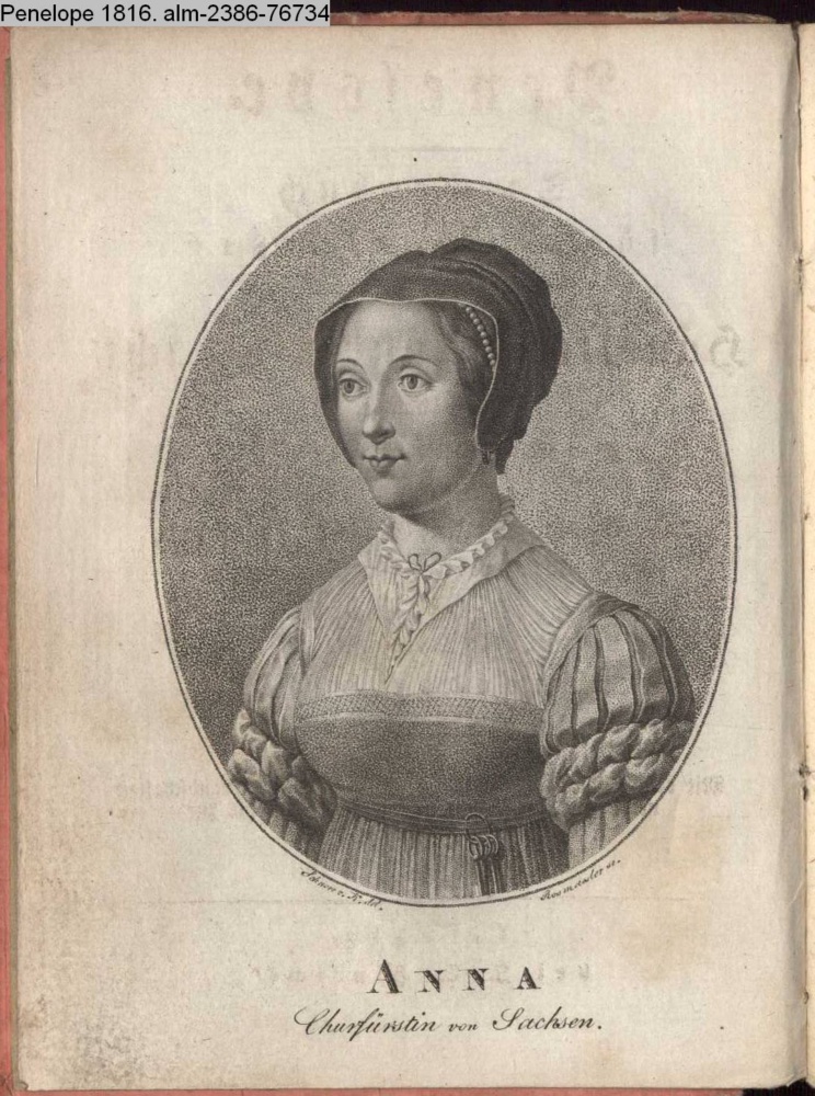 Penelope. / Taschenbuch / für das Jahr 1816 / der / Häuslichkeit und Eintracht / gewidmet. / Mit Beiträgen / von / L. v. Germar, Fr. Gleich, Fr. Kind, / Aug. Lafontaine, Fr. Laun u. a. / Herausgegeben / von / Theodor Hell. / Mit dem Bildniß der Anna, neun Kupfern und Landschaften / nebst zwei Tafeln mit den neuesten Desseins zur / Modestick- und Strickerei. / Leipzig, / bei J. C. Hinrichs