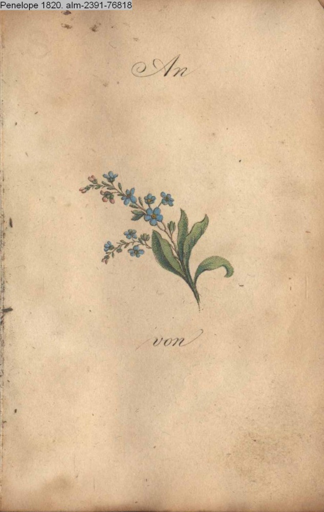 Zueignungsblatt mit koloriertem Vergißmeinnicht