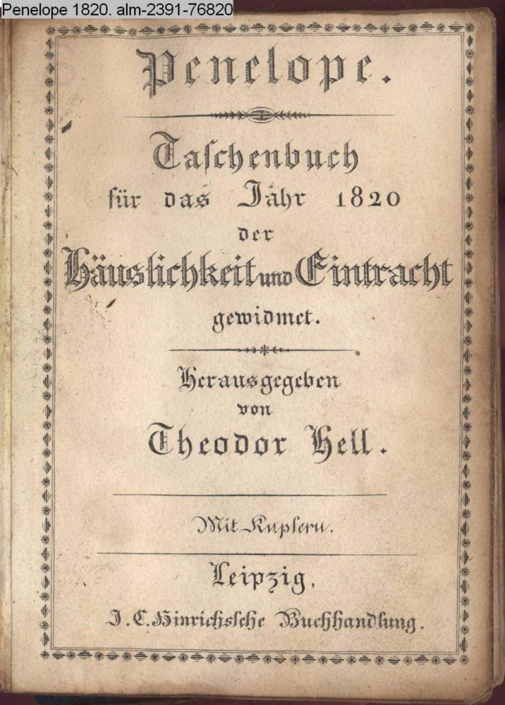 Penelope. / Taschenbuch / für das Jahr 1820 / der / Häuslichkeit und Eintracht / gewidmet. / Herausgegeben / von / Theodor Hell. / Mit Kupfern. / Leipzig. / J. C. Hinrichssche Buchhandlung