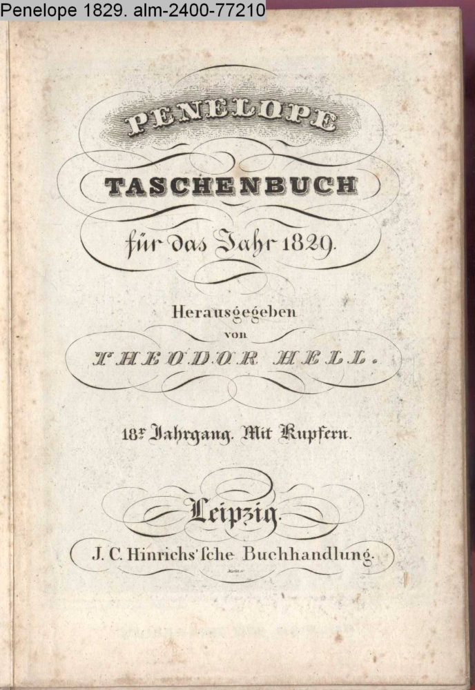 PENELOPE / TASCHENBUCH / für das Jahr 1829. / Herausgegeben / von / THEODOR HELL. / 18r. Jahrgang. Mit Kupfern. / Leipzig. / J. C. Hinrichs'sche Buchhandlung