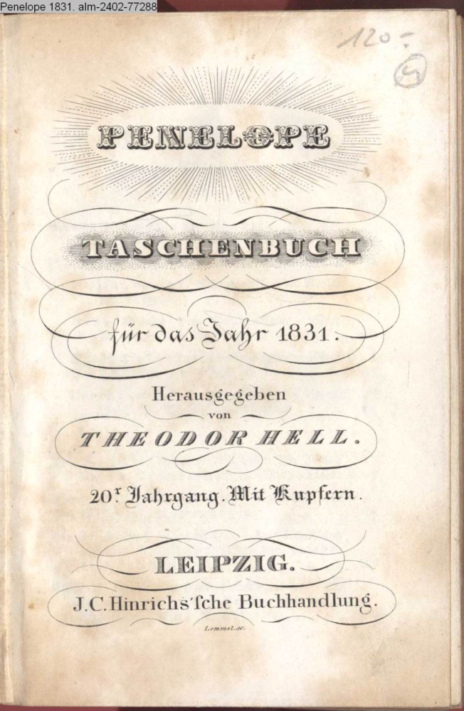 PENELOPE. / TASCHENBUCH / für das Jahr 1831. / Herausgegeben / von / THEODOR HELL. / 20r. Jahrgang. Mit Kupfern. / Leipzig. / J. C. Hinrichs'sche Buchhandlung