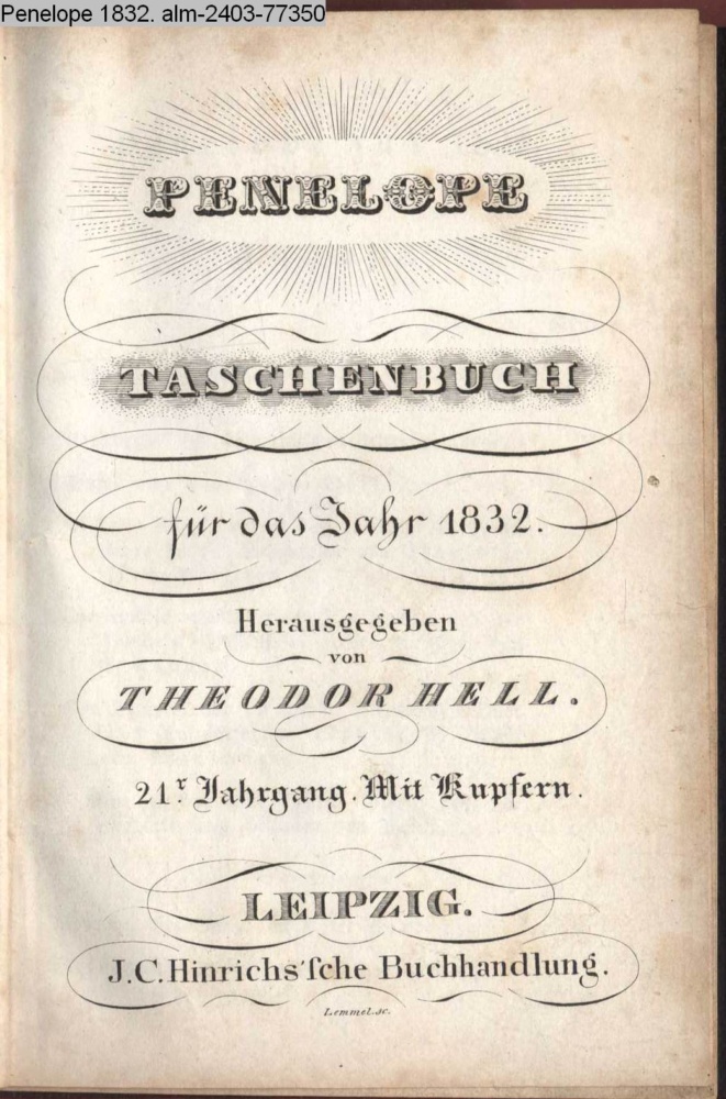 PENELOPE / TASCHENBUCH / für das Jahr 1832. / Herausgegeben / von / THEODOR HELL. / 21r. Jahrgang. Mit Kupfern. / LEIPZIG. / J. C. Hinrichs'sche Buchhandlung