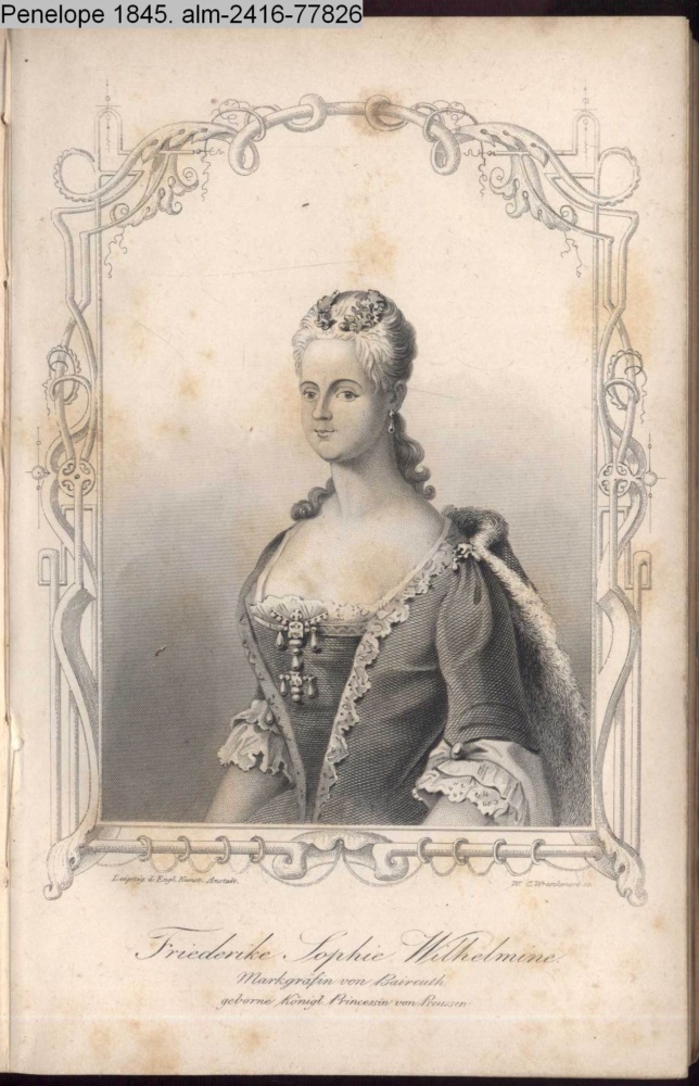 Friederike Sophie Wilhelmine, / Prinzessin von Preußen, / Markgräfin von Bayreuth. / Geb. am 3. Juli 1709, gest. am 14. October 1758