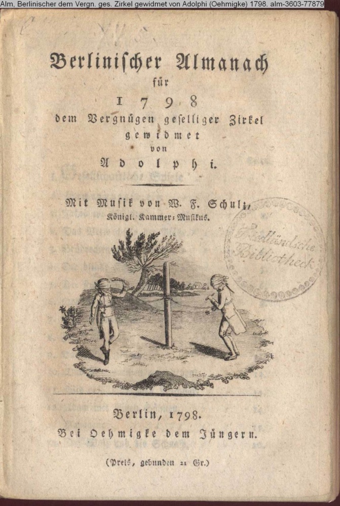 Berlinischer Almanach / für / 1798 / dem Vergnügen geselliger Zirkel / gewidmet / von / Adolphi. / Mit Musik von W. F. Schulz, / Königl. Kammer-Musikus. / Berlin, 1798. / Bei Oehmigke dem Jüngern. / (Preis, gebunden 21 Gr.)