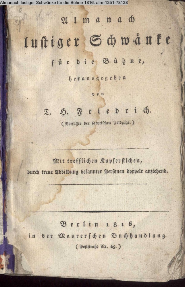 Almanach / lustiger / Schwänke / für die Bühne, / herausgegeben / von / T. H. Friedrich. / (Verfasser der satyrischen Feldzüge.) / Mit trefflichen Kupferstichen, / durch treue Abbildung bekannter Personen doppelt anziehend. / Berlin 1816, / in der Maurerschen Buchhandlung. / (Poststraße Nr. 29.)