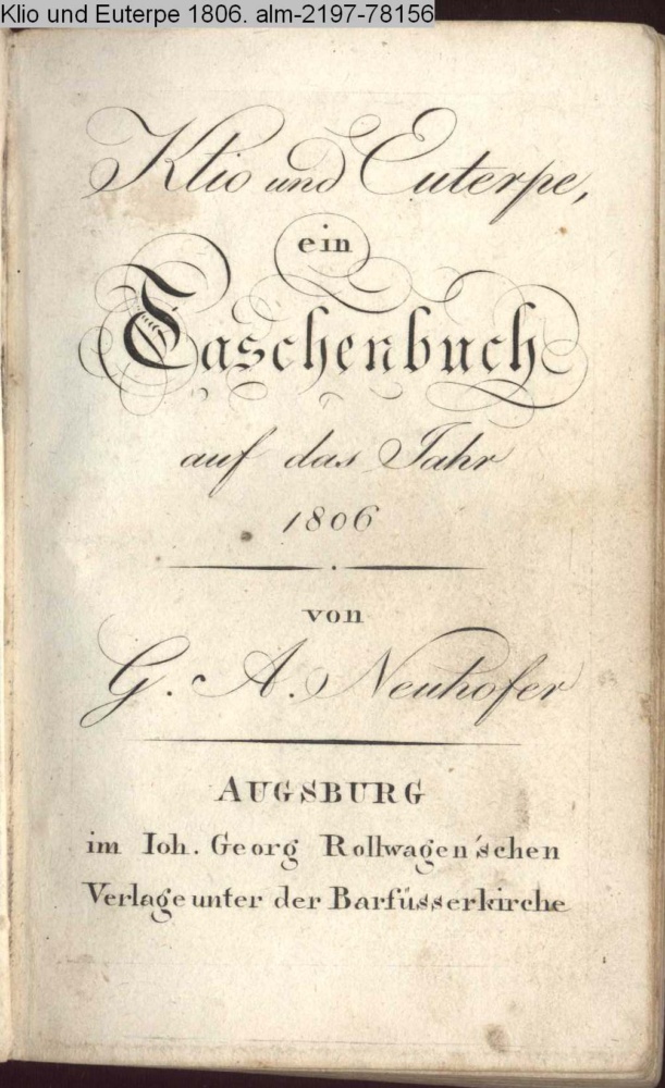 Klio und Euterpe, / ein / Taschenbuch / auf das Jahr / 1806 / von / G. A. Neuhofer / AUGSBURG / im Joh. Georg Rollwagen'schen / Verlage unter der Barfüsserkirche