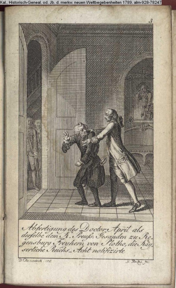 Abfertigung des Doctors April als / derselbe dem K. Preuss. Gesandten zu Re- / gensburg, Freyherrn von Plotho, die Kay- / serliche Reichs-Acht notifizierte