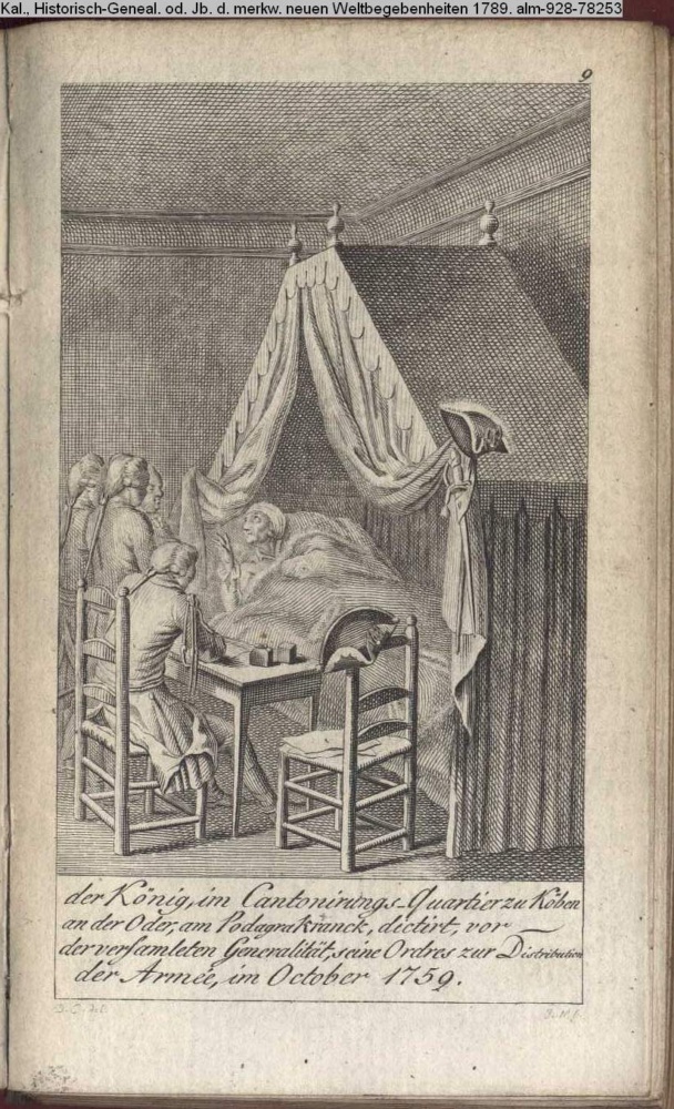 der König im Cantonirungs-Quartier zu Köben / an der Oder, am Podagra kranck, dictirt, vor / der versamleten Generalität, seine Ordres zur Distribution / der Armée, im October 1859