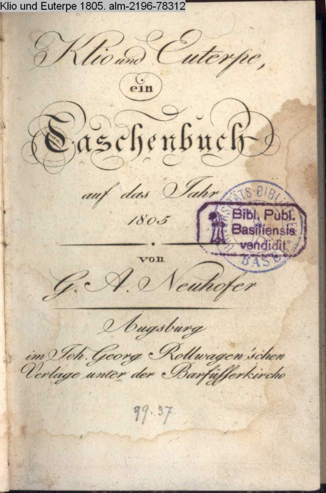 Klio und Euterpe, / ein / Taschenbuch / auf das Jahr / 1805 / von / G. A. Neuhofer / Augsburg / im Joh. Georg Rollwagen'schen / Verlage unter der Barfüsserkirche