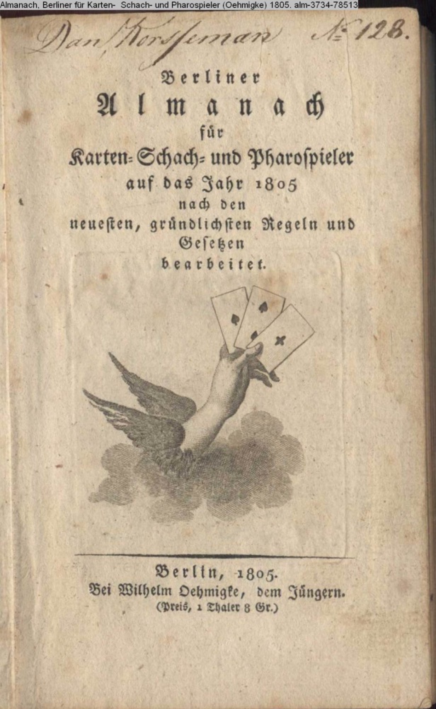 Berliner / Almanach / für / Karten- Schach- und Pharospieler / auf das Jahr 1805 / nach den / neuesten, gründlichsten Regeln und Gesetzen / bearbeitet. / Berlin, 1805. / Bei Wilhelm Oehmigke, dem Jüngern. / (Preis, 1 Thaler 8 Gr.)